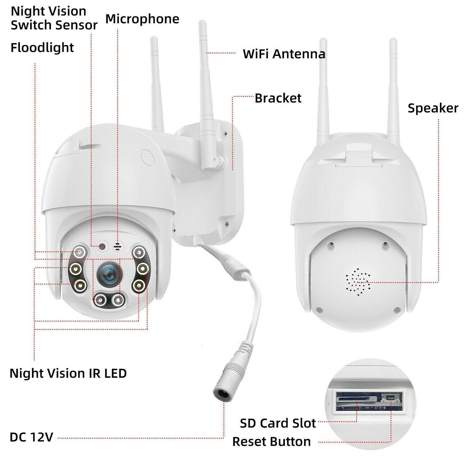 2. This Wireless Camera includes a Night Vision Switch Sensor with IR LEDs, Floodlights, Microphone and Speaker for 2-Way Speaking Audio, SD Card Slot for onboard memory, Reset Button, and a DC12V power supply with U.S. Plug. 3. Enjoy and Keep your property safe!