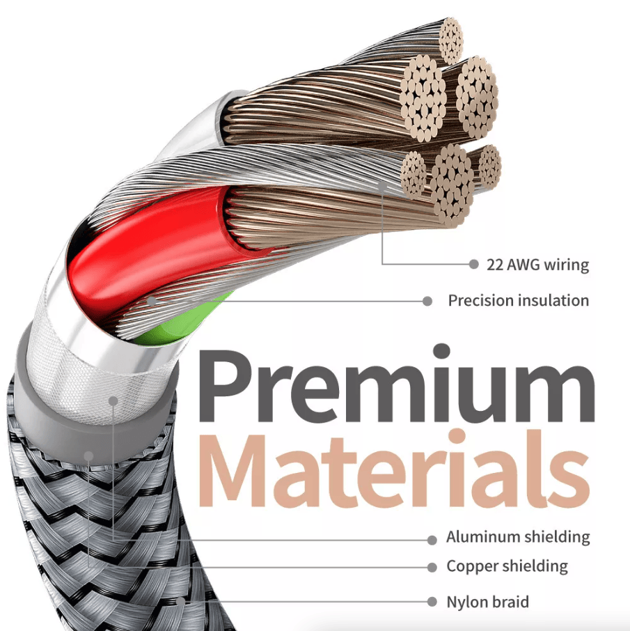 4 Stage Shielding of Insulation, Aluminum, Copper, and Nylon. Paired with 22 AWG wiring which will ensure long lasting durability. Nylon braid is the highest standard of quality cables.