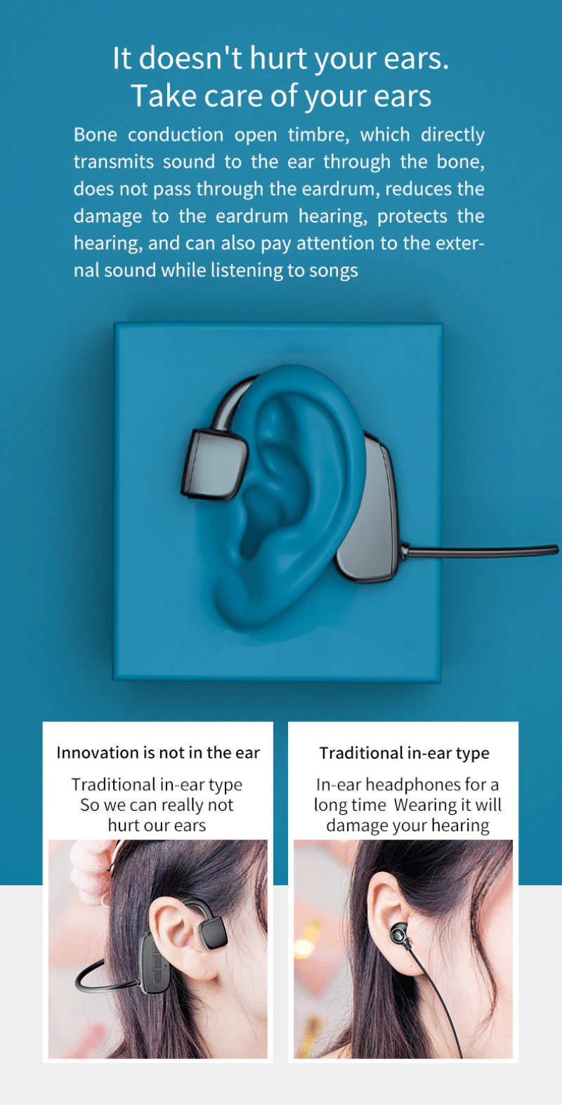 Latest Bone Conduction Technology Unlike traditional earbuds which transmit audio through air into your ear canal, bone conduction headphones delivery sound through your skull directly to inner ear. Hearing damage can be avoided compared to regular headphones. The open-ear design helps you keep an eye on the vibrancy of the surrounding sounds and reduce traffic accidents and other hazards when listening to music.
